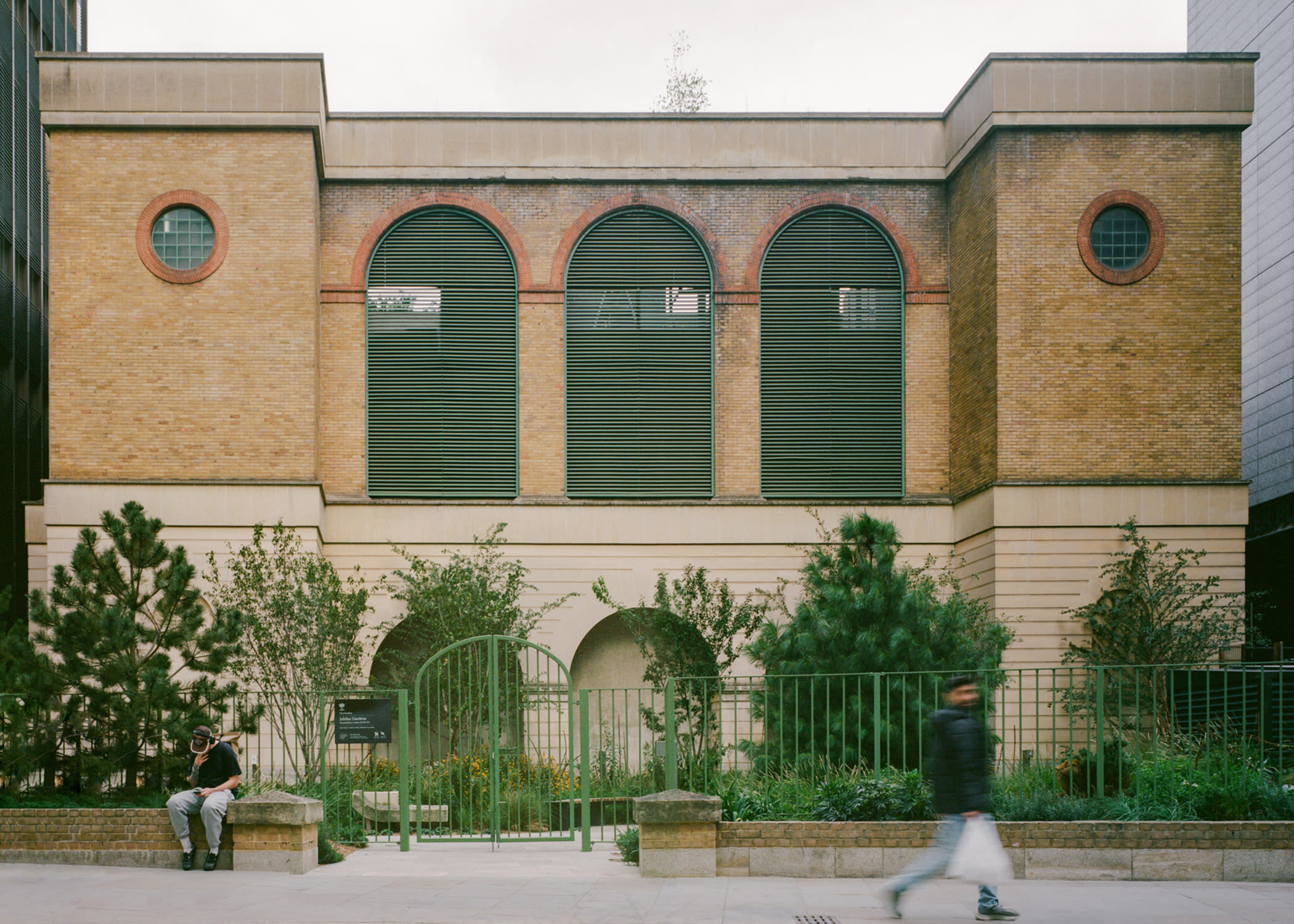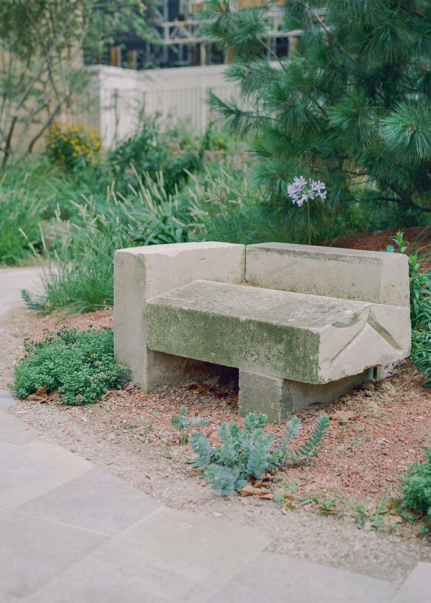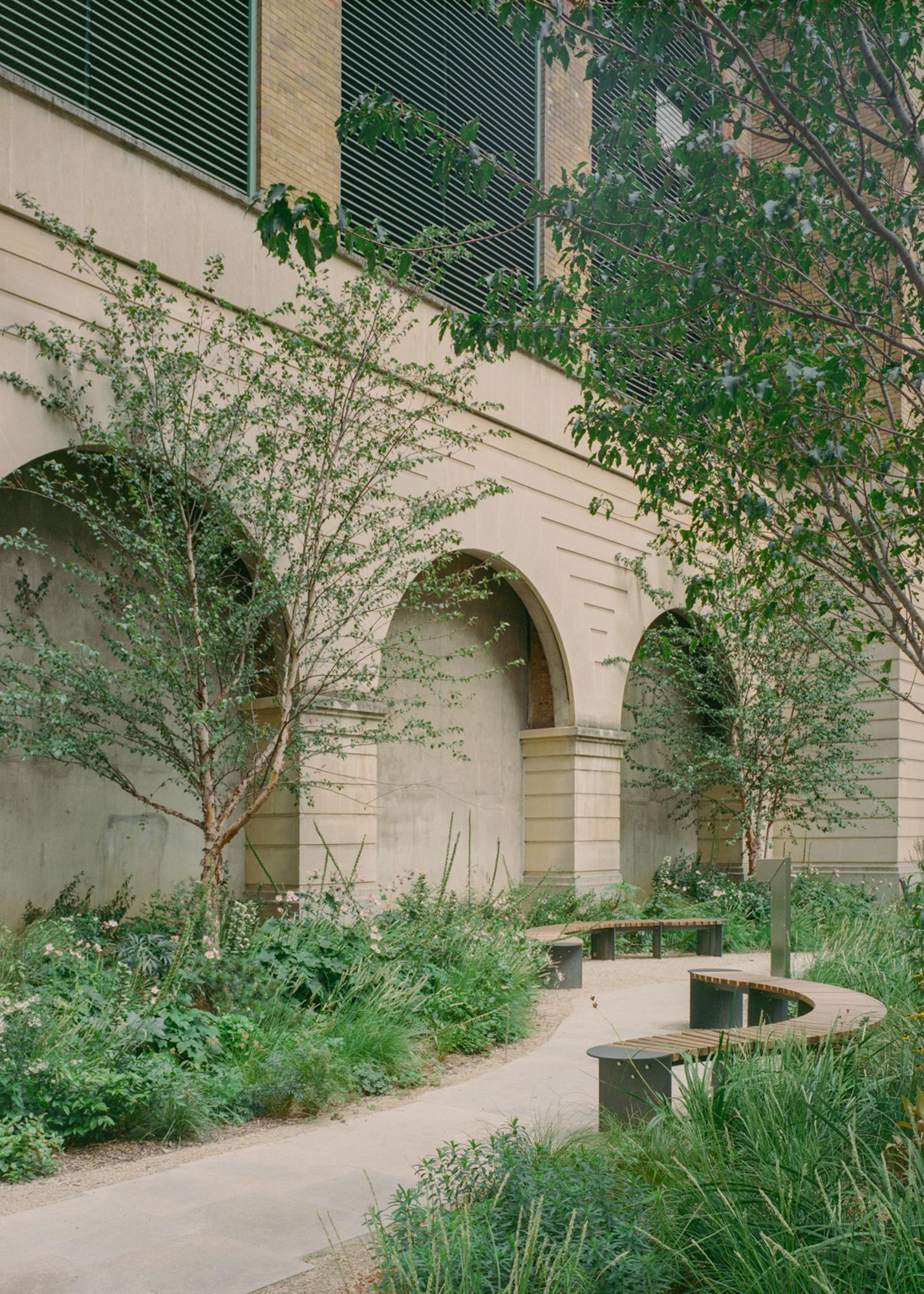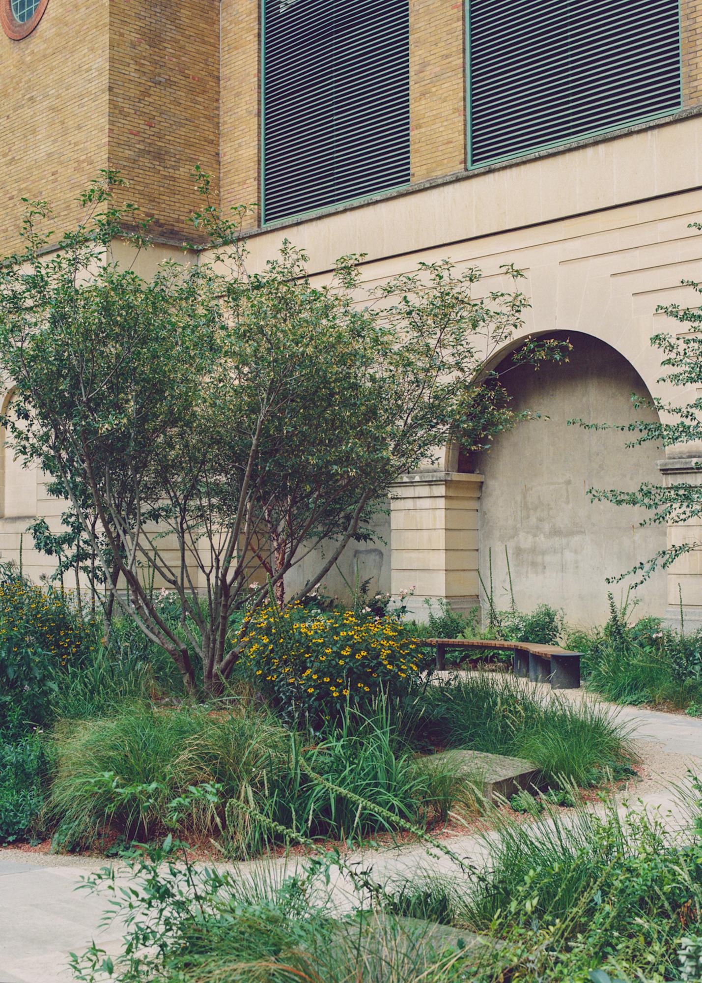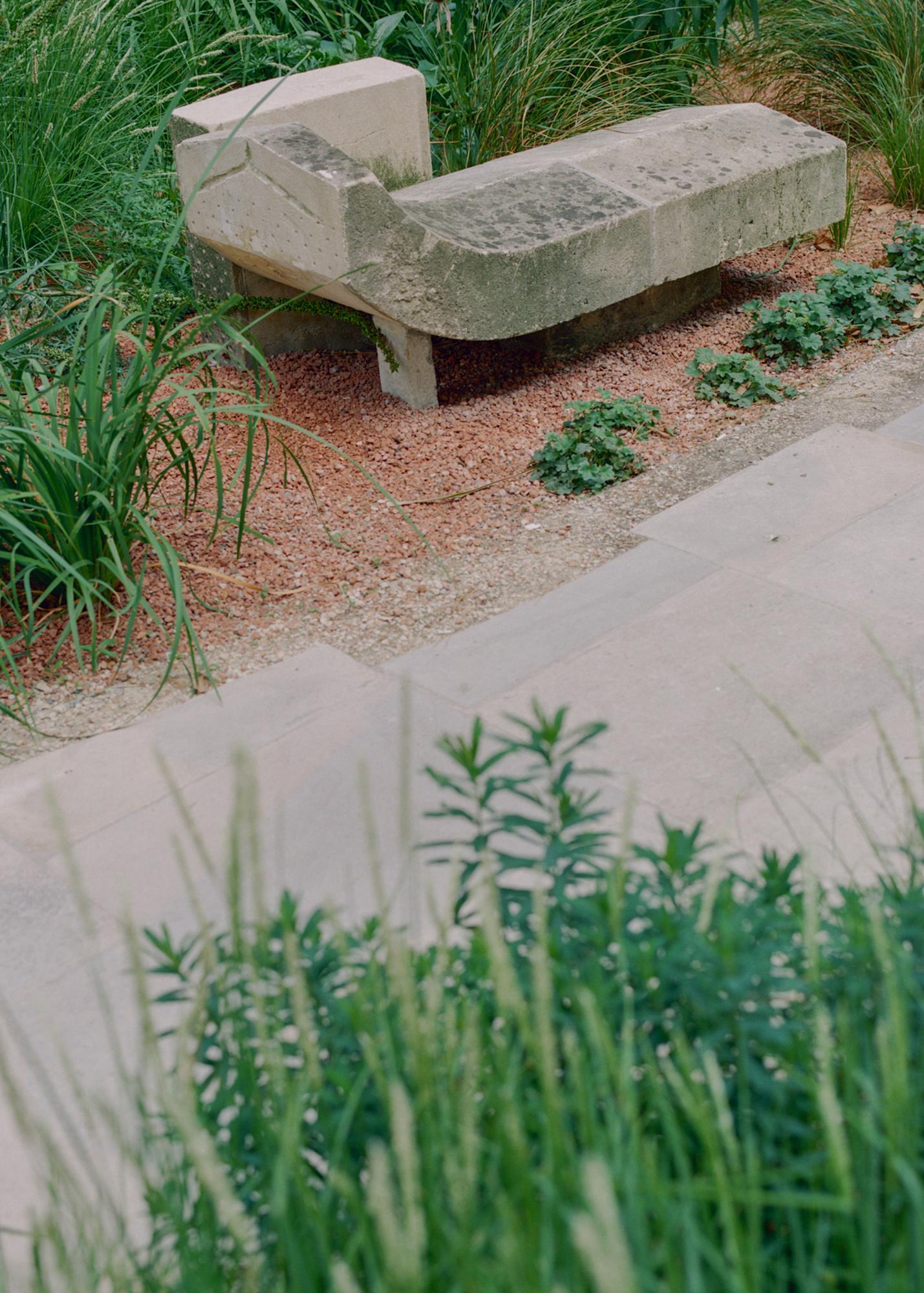 A detailed survey of the existing garden – characterised by a limestone-clad masonry perimeter wall enclosing a formal grid limestone pathways between brown brick raised planters – identified opportunities to improve the character by dismantling existing elements and reconfiguring them. On-site modifications include: cutting the perimeter wall down to a datum allowing views between interior and exterior; replacing the raised planters with in-ground planting which is less enclosing and more visible; reshaping the limestone pathways as more varied meandering routes and quiet seating areas; and reusing site-won bricks and coping stones to assemble habitat piles drilled with holes for bees and invertebrates.