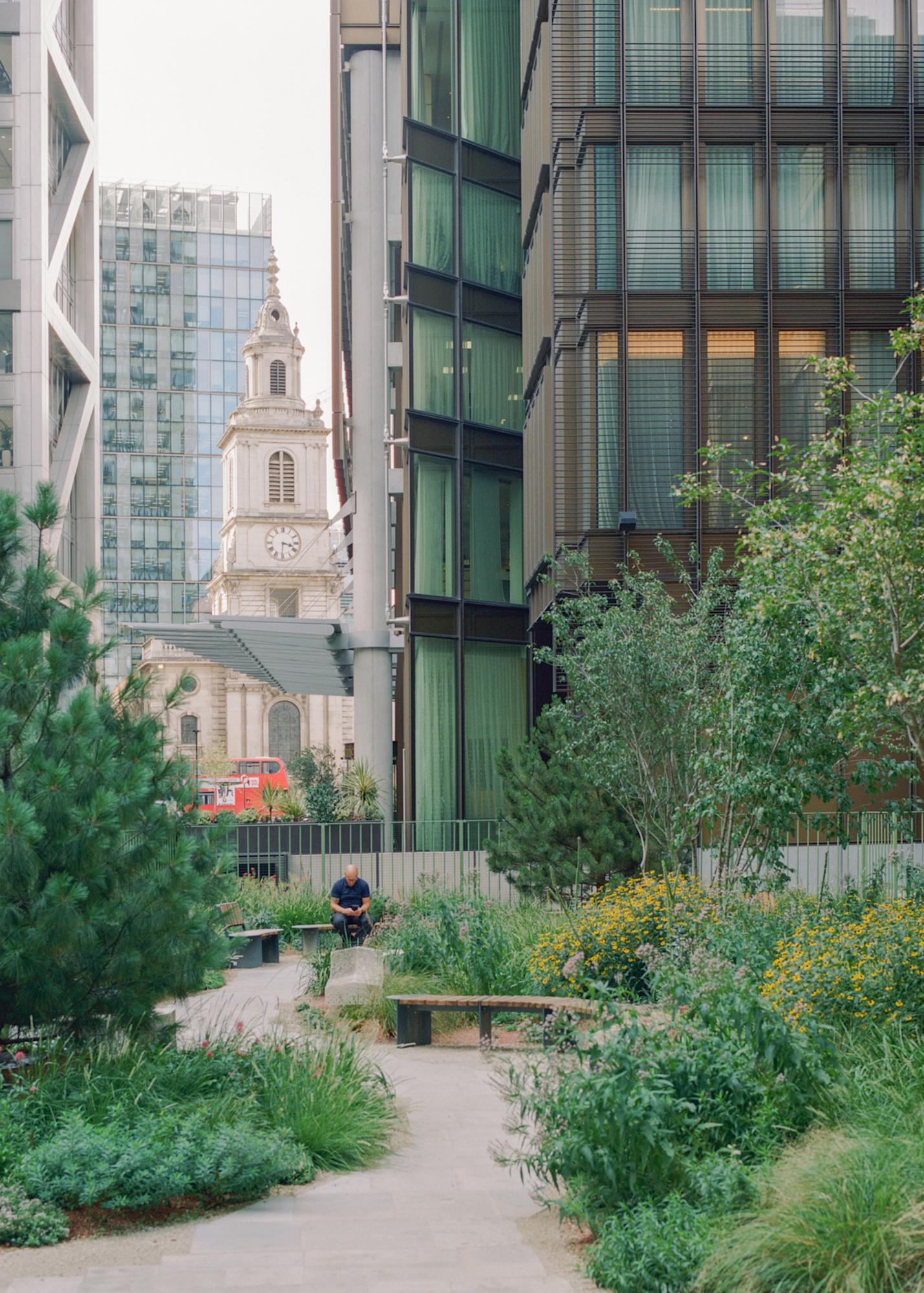 Studio Weave were appointed to redesign Jubilee Gardens, following successful collaborations on our Finsbury Circus Gardens and Bank Junction Improvements projects. The project site - a pocket garden on Houndsditch, between Liverpool Street Station and the City Cluster – sits on top of an active subterranean UKPN power station, and was one identified ‘in need of climate resilience’ in the Square Mile. Our scheme establishes a new benchmark for climate responsive design in the city, maximising opportunities to reduce embodied and operational resource usage.